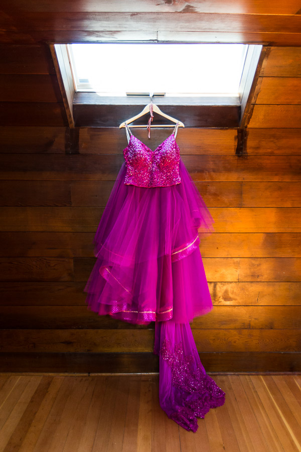 /This vibrant bride knew that she needed color, and she settled on a magical mix of fuchsia and gold. We had so much fun searching for fabrics, laces and accent details that matched her vision. A dramatic detachable train completed the look for walk down the aisle. Her fiancé already had a suit, but needed a matching vest, so we set to work creating a linen fuchsia vest with a fun patterned back and matching pocket square. All of their wedding guests were asked to wear white and the contrast was stunning!