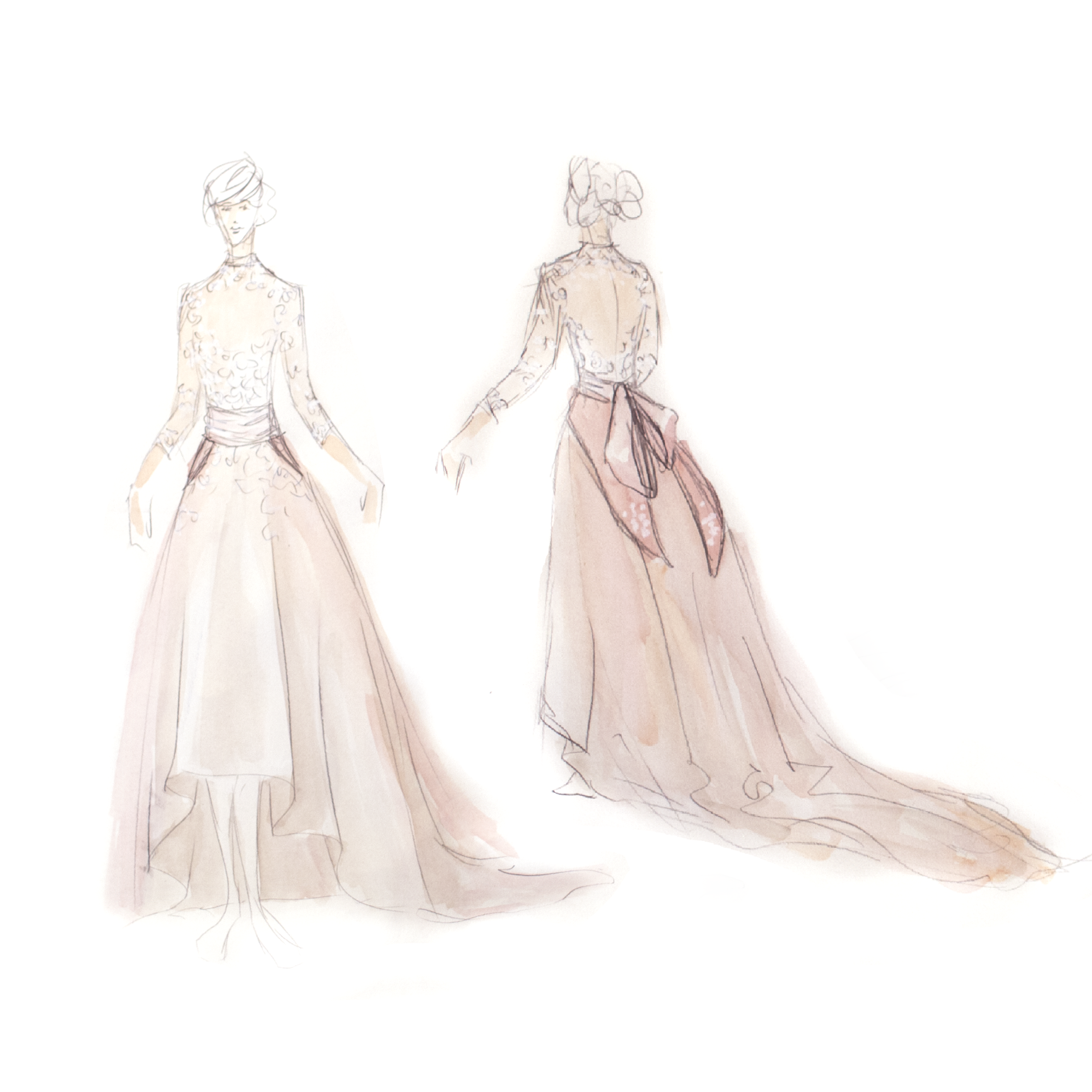 But after talking with Sarah and Christina about creativity, their backgrounds, my background, and everything in between, I knew I had to work with them no matter what I decided. I'm a writer, and I enjoy writing fairytales. I wrote a fairytale about my husband and I, where I was represented as a fox. Sarah blew me away with her initial sketches by creating a dress inspired by a fox. The dress mimicked fox colors by being completely white in the front while having a "tail" of voluminous tulle in an ombre of pinks, corals, and oranges. The one thing I knew I did want in a dress was a high collar which Sarah included in her drawings. And to complete the look, she added delicate coattails to complement the masculinity and Victorian of the high collar. Something I would have never thought of or considered but was absolutely perfect.